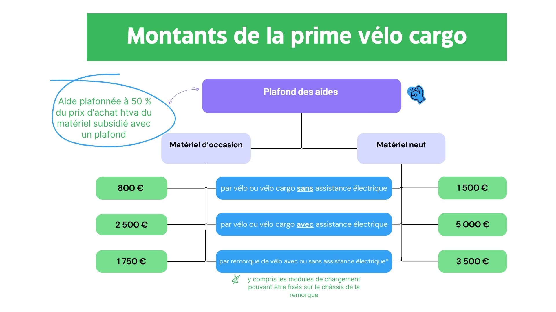 - 3.500 euros par remorque de vélo neuve, avec ou sans assistance électrique, en ce compris les modules de chargement pouvant être fixés sur le châssis de la remorque