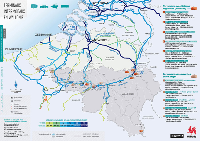 - Dépliant regroupant 3 cartes (PDF) : les terminaux intermodaux en Wallonie, l'intégration du projet Seine-Escaut dans le réseau belge et la modernisation du réseau fluvial en Wallonie (édition 2019)